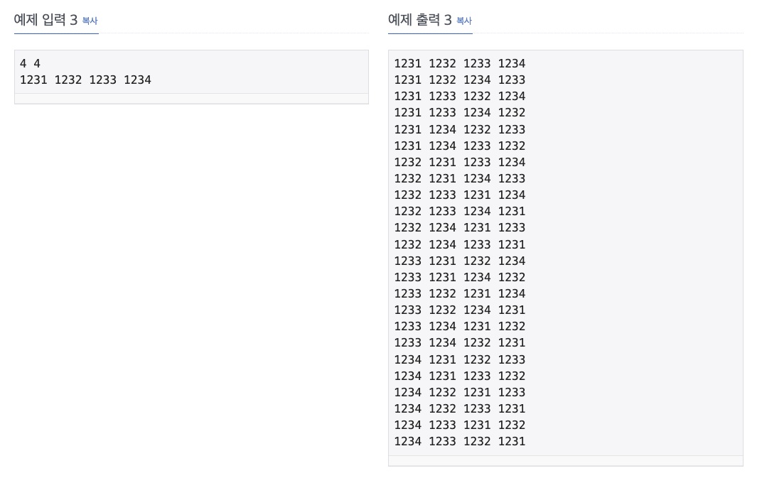 배열을 통해 밑에 한줄 입력을 받고, 그리고 중복을 허용 안하니 백트래킹으로 가지치기를 하고, a[t] = i 가 아닌 새로운 배열 받은걸 그대로 a[t]에 받아주면 된다.