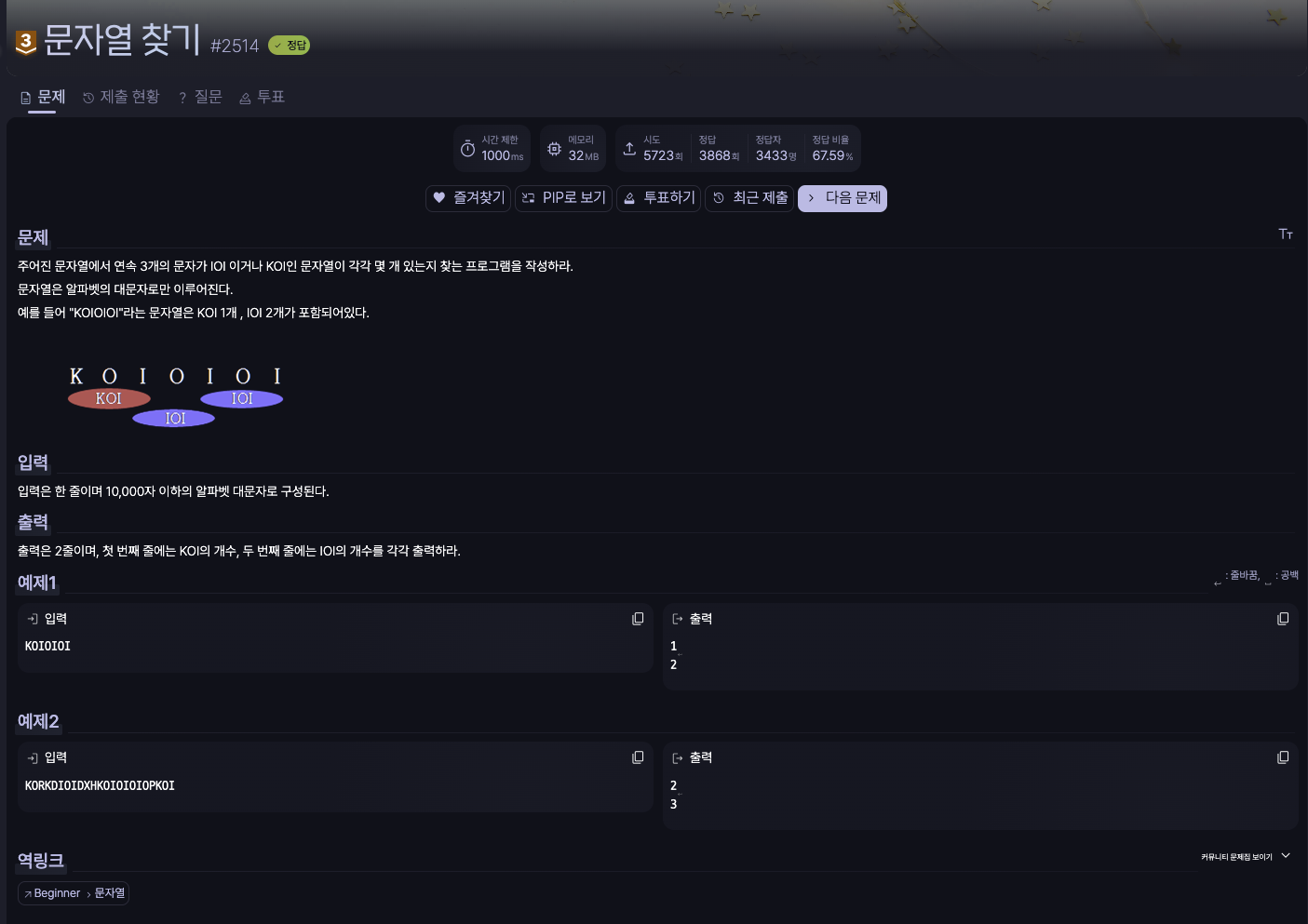 npos를 써서 체크하려 했지만 npos는 정확히 매칭되는 거만 찾지 문제에 나와있듯에 KOIOI에서 KOI가 한번 IOI가 한번 나와줘야 정상인데 npos를 쓴다면 KOI가 한번밖에 나오지 않음.