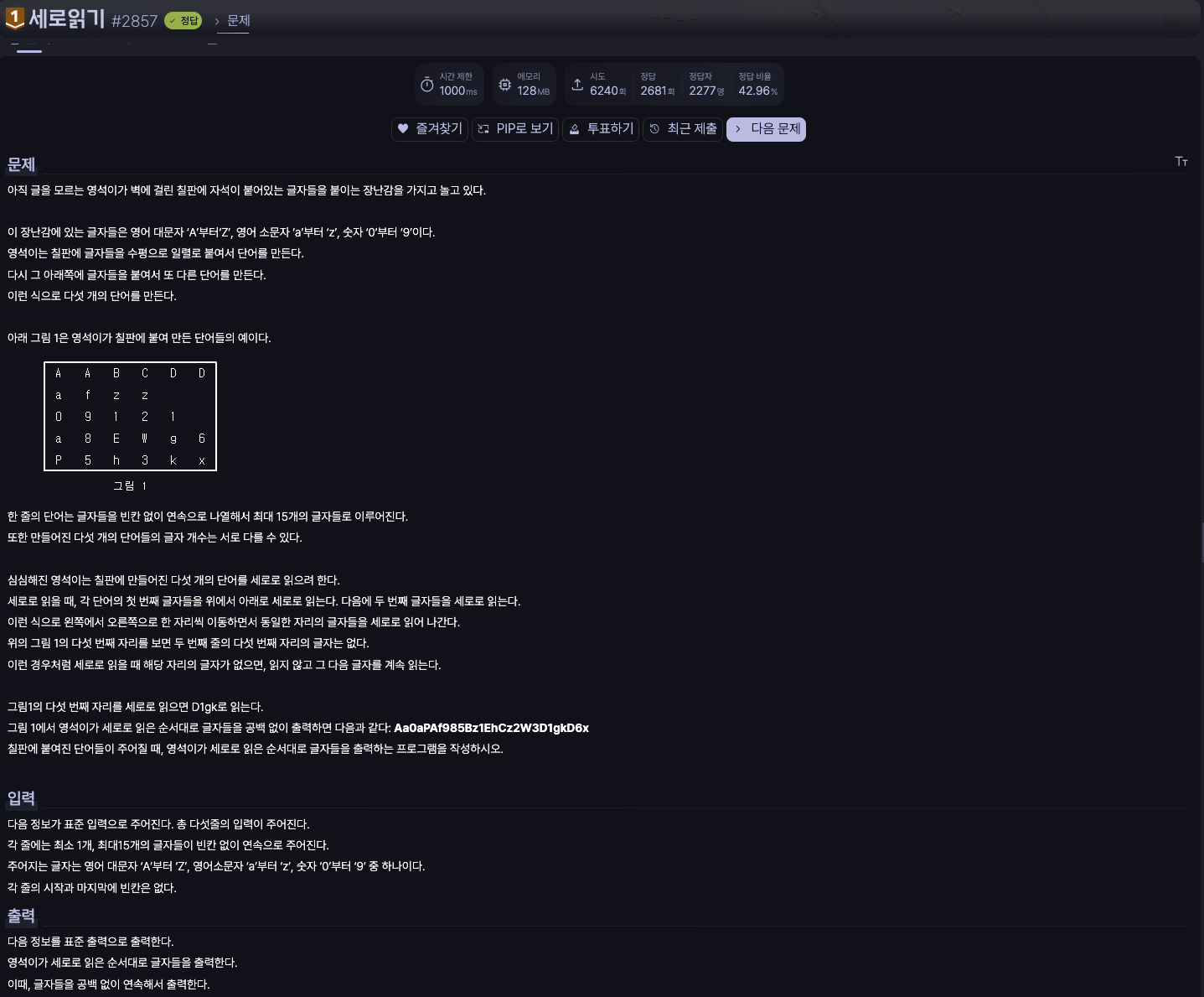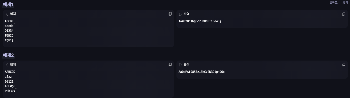 따라서 memset() 으로 먼저 2차원 배열을 ' '로 지정시키고, 아예 string을 가져와서 단어를 ABCDE abcde 식으로 공백을 포함한 단어를 2차원 배열에 글자 형태로 저장한 후 공백이 없는 글자들만 문제에서 원하는 대로 출력시키는 접근으로 바꿈.