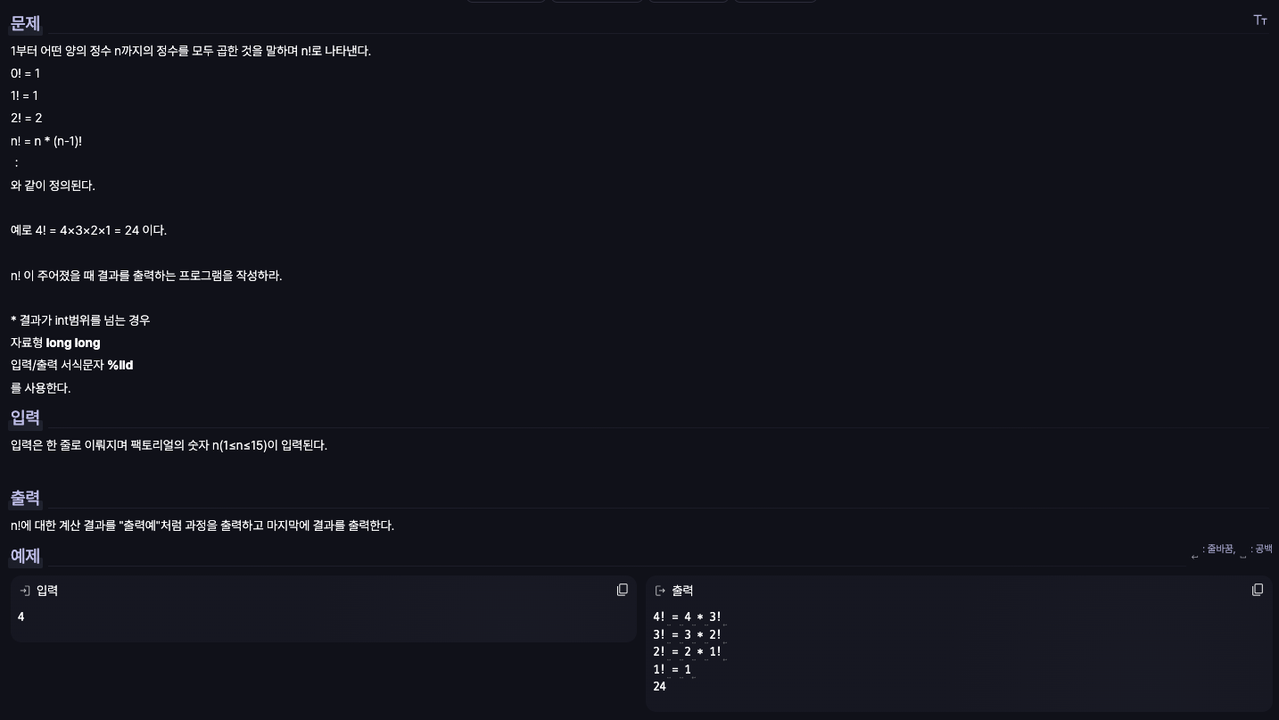 z가 0보다 클때부터 계속 z 감소시키면서 팩토리얼 출력, 1일때는 원하는 형태로 출력하고 값 계속 ans에 *= 형태로 저장시키고,
