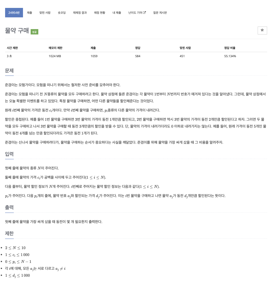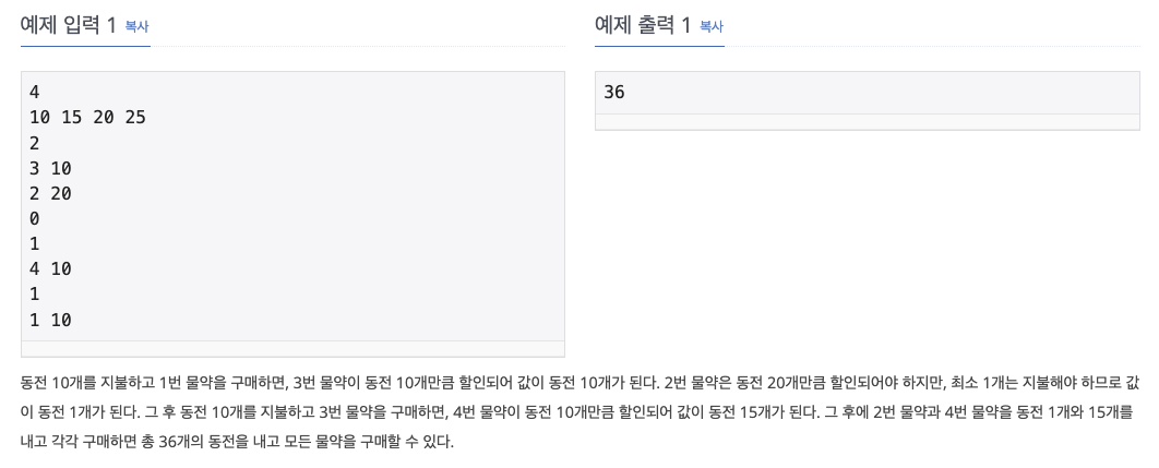 answer = min(result, answer); //가장 '저렴하게' 구매한 물약의 동전 개수